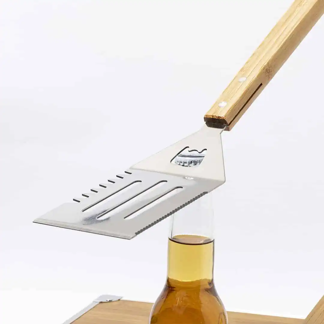 Deze barbecue set kan niet ontbreken tijdens jouw barbecue! De set is uitgevoerd in RVS en bestaat uit een vork, spatel en tang. In de spatel zit ook een flesopener, waardoor je kunt genieten van een heerlijk biertje tijdens het grillen van het vlees. Je kunt het barbecuegereedschap gemakkelijk opbergen en overal mee naartoe nemen in de meegeleverde opbergkoffer. De koffer is gemaakt van bamboe en is daardoor een duurzaam product. Je kunt de koffer afsluiten met de 2 veiligheidssluitingen en gemakkelijk meedragen aan het handvat. Erg handig voor een barbecue thuis bij familie of vrienden. Deze handige RVS BBQ set is het ideale cadeau voor de echte grillmasters!