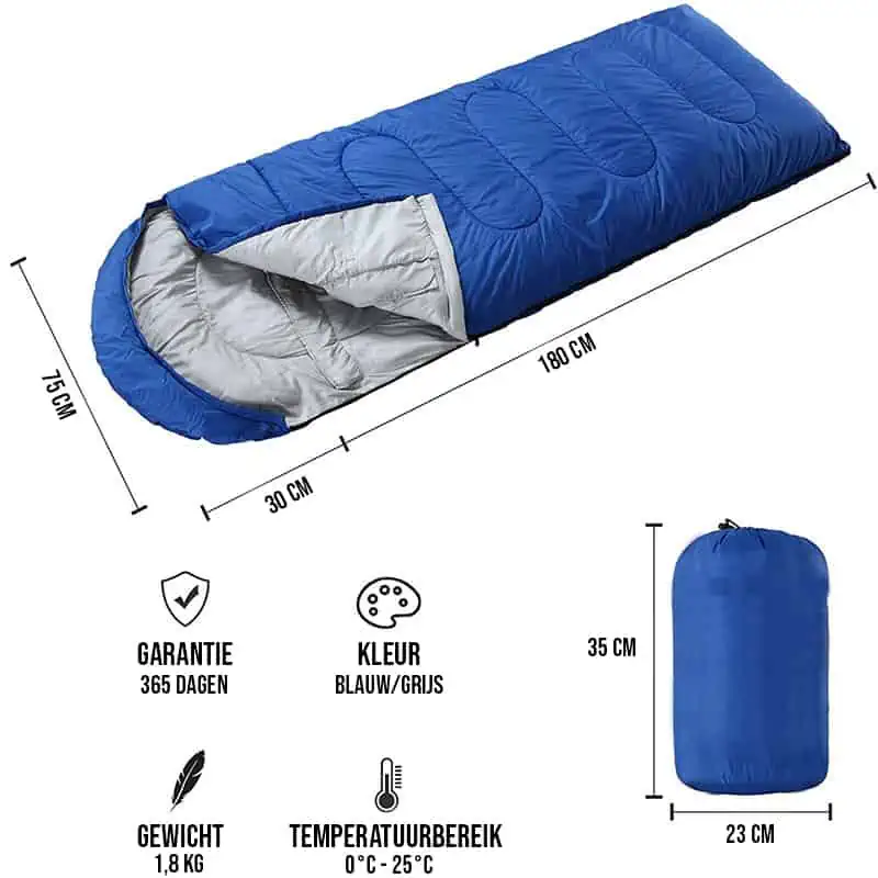 Ga jij binnenkort kamperen op een festivalcamping? Dan kan deze heerlijk warme deken slaapzak niet ontbreken tussen jouw kampeerspullen! Het fijne van een deken slaapzak is dat je altijd voldoende bewegingsvrijheid hebt wanneer je erin ligt. Heb je het ‘s nachts koud? Rits dan de slaapzak open en gebruik hem als deken. Heb je het daarna weer koud? Rits dan de slaapzak helemaal dicht en kruip er lekker warm in. De buitenkant van de slaapzak is gemaakt van synthetisch materiaal en de binnenkant is gemaakt van polyester. De slaapzak heeft een temperatuurbereik tussen de 0°C en 25°C. Hierdoor is de temperatuur in de slaapzak altijd comfortabel en kun jij genieten van een heerlijke nachtrust. De hoogwaardige materialen zorgen voor een optimale warme isolatie en ventilatie. De slaapzak is 75 cm breed en 180 cm lang. De totale lengte inclusief het kussen is 210 cm. Rits de slaapzak helemaal open om er een deken van te maken, deze is wel 150 cm breed en 180 cm lang! De maximale lichaamslengte geschikt voor deze slaapzak is ca. 180 cm. Je kunt de slaapzak na gebruik opbergen in het meegeleverde opbergzakje en eenvoudig overal mee naartoe nemen. Met deze heerlijk warme deken slaapzak ben jij helemaal klaar voor je volgende kampeertrip op de festivalcamping!