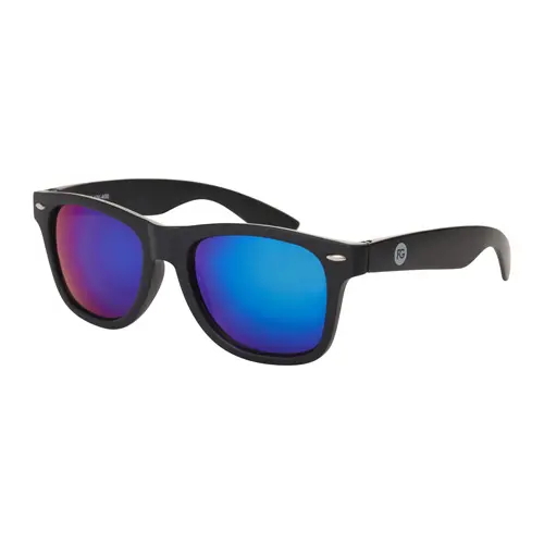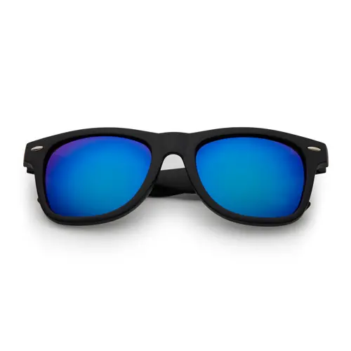 Populaire party zonnebril met mat zwart montuur en blauwespiegel lenzen. De klassieker der klassiekers!