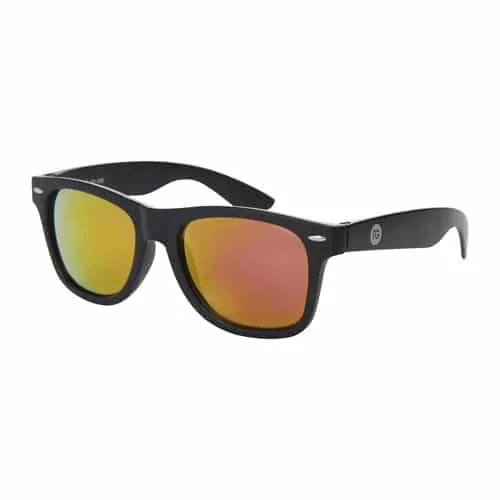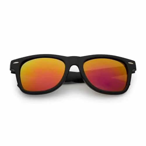 <p>Populaire party zonnebril met mat zwart montuur en oranjespiegel lenzen. De klassieker der klassiekers!</p>