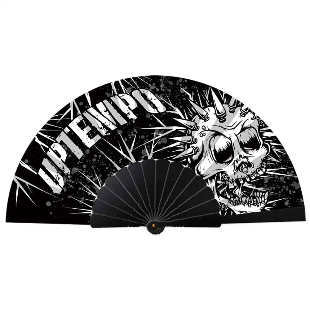 Op een warme festivaldag is een handwaaier onmisbaar! Lekker even afkoelen en de warmte van je afwaaien? Dan is deze deluxe festival waaier perfect voor jou! De Spaanse waaier is gemaakt van stevig kunststof met een polyester doek en heeft een leuke Uptempo print. Leuk om mee te nemen naar een hardcore festival! De waaier is 42 cm breed en 23 cm hoog en kan niet ontbreken in jouw verzameling festival accessoires. Deze waaier is geschikt voor alle uptempo fans!