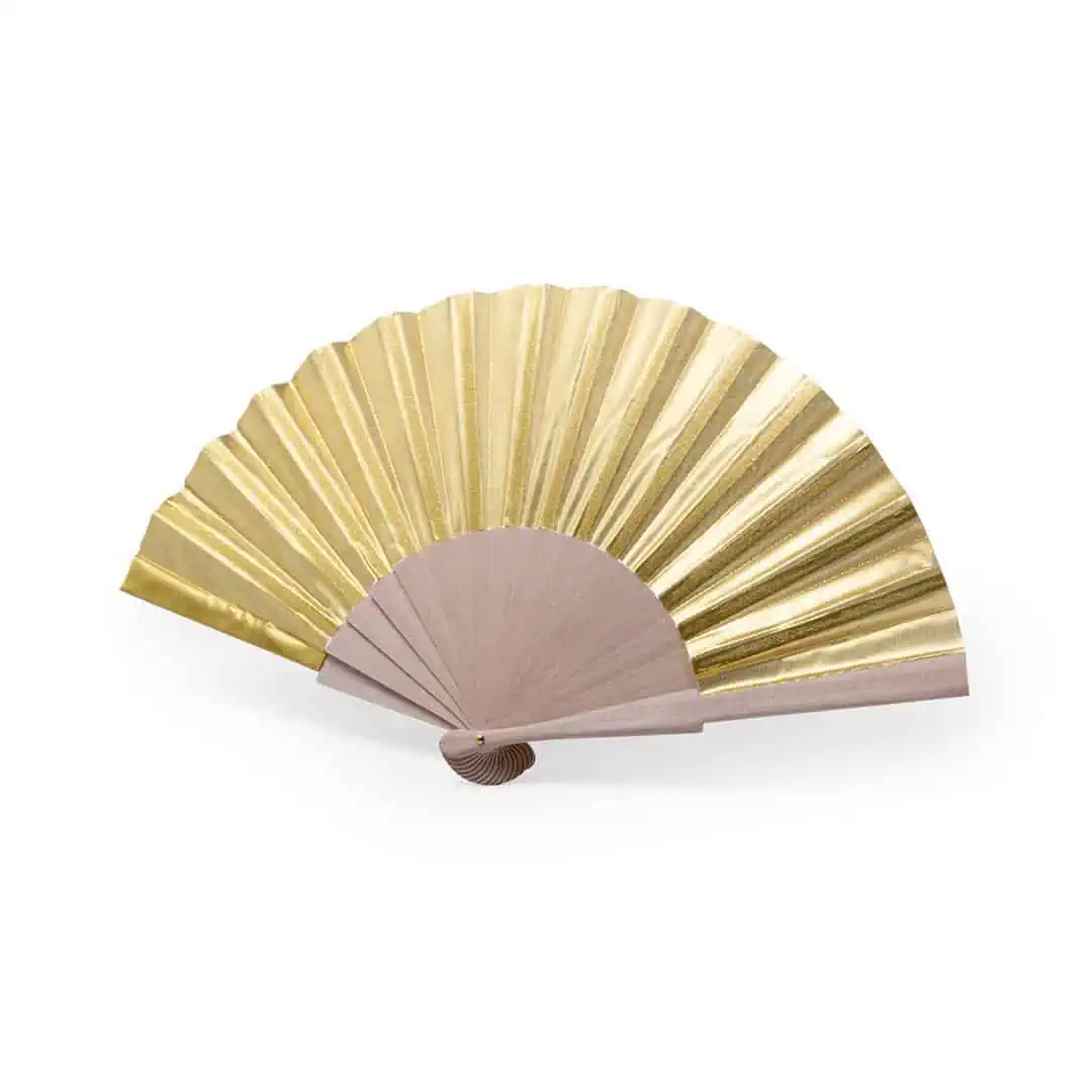 Deze houten handwaaier met gouden doek is het perfecte festival accessoire!
