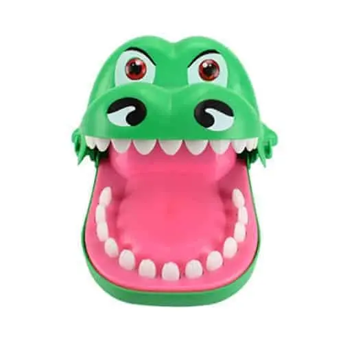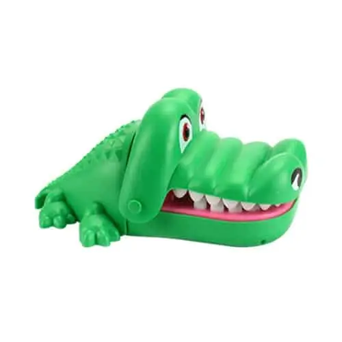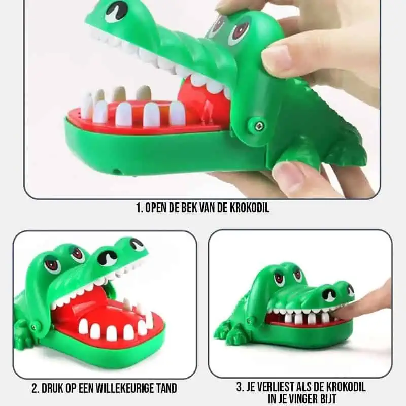 Beleef veel speelplezier met dit spannende krokodillenspel! Zet de bek van de krokodil open en druk om de beurt een tand van de krokodil naar beneden. Als je op de zere tand van de krokodil drukt, bijt hij en heb je het spel verloren! Dit spel is geschikt voor kinderen vanaf 3 jaar, maar is ook leuk voor volwassenen om te gebruiken als onderdeel van een drankspel. Dit spannende krokodillenspel is leuk om te spelen voor jong en oud!Â