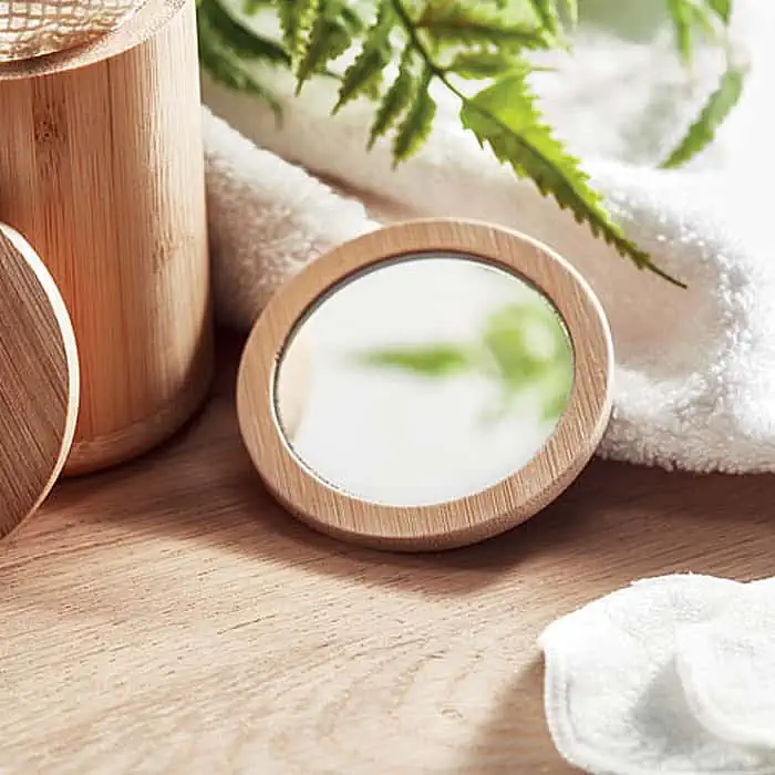 Dit kleine make-up spiegeltje is ideaal om bij je te hebben als je, je make-up aanbrengt of om snel even je gezicht te bekijken. Je kunt het make-up spiegeltje gemakkelijk opbergen in het meegeleverde katoenen opbergzakje met trekkoord. Het spiegeltje is afgewerkt met een prachtige bamboe rand en heeft een diameter van 8 cm. Ideaal voor in je handtas!Â