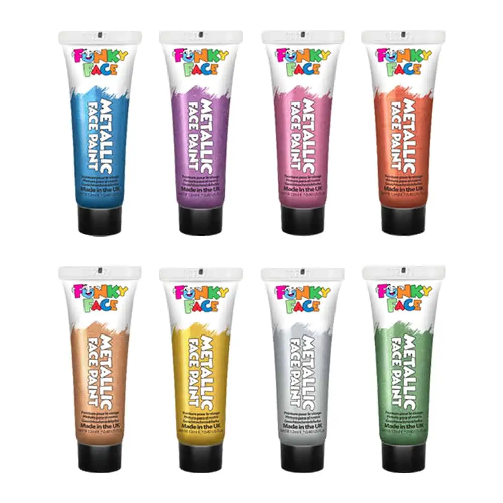 Maak jouw festival look helemaal af met deze set Metallic Face & Body paint! Deze verf van PaintGlow is geschikt om te gebruiken op het lichaam en het gezicht. Een tube Metallic verf heeft een inhoud van 12 ml. De crèmige textuur zorgt ervoor dat de verf niet vlekt en heel de dag perfect blijft zitten. Deze kleurrijke metallic verf is op waterbasis en is daardoor ook geschikt voor het schminken van kinderen. De set bestaat uit 8 prachtige kleuren: blauw, groen, roze, paars, rood, goud, zilver en rosé goud.