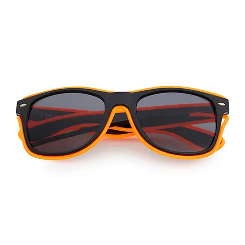 Shine in the dark! Deze zwarte LED bril heeft een UV-400 zonnebril lens en oranje EL wire NEON.