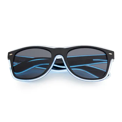 Shine in the dark! Deze zwarte LED bril heeft een UV-400 zonnebril lens en witte EL wire NEON.