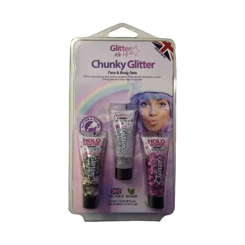 Deze Glitter Me Up Chunky Glitter face & body gel set is ideaal om een trendy sprankeling toe te voegen aan je festival outfit! De voorgemengde op waterbasis gemaakte formule zorgt ervoor dat er geen lijm nodig is, hierdoor kun je binnen enkele minuten je eigen prachtige ontwerp maken. Geschikt voor gezicht en lichaam, verwijder de foliedop en breng de glitters aan op het gewenste gebied. Dit kan makkelijk met je vingers of een sponsje. Ook goed te combineren met face jewels van Paintglow. De compacte 12ml tubes zijn gemakkelijk mee te nemen in je tas of broekzak zodat je onderweg je glitter effect kunt aanvullen. De set bestaat uit 3 tubes in het roze, zilver en transparant.