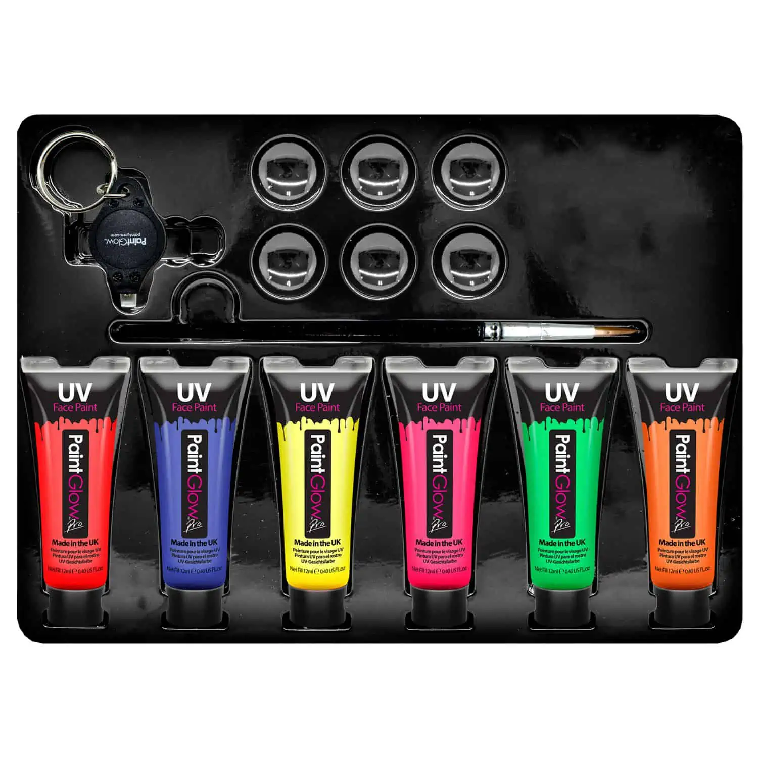 Paintglow UV verf is smooth, dik & romig, droogt snel op de huid en blijft de hele nacht zitten. De kleuren zijn heel helder bij daglicht en lichten spectaculair op bij blacklights. Deze UV verf is van de hoogste kwaliteit en bruikbaar op gezicht en lichaam. In de verpakking zitten 6 x 13 ml tubes in verschillende kleuren, een kwastje en een UV lichtje, waarmee je meteen na het aanbrengen het effect van de verf kunt zien.