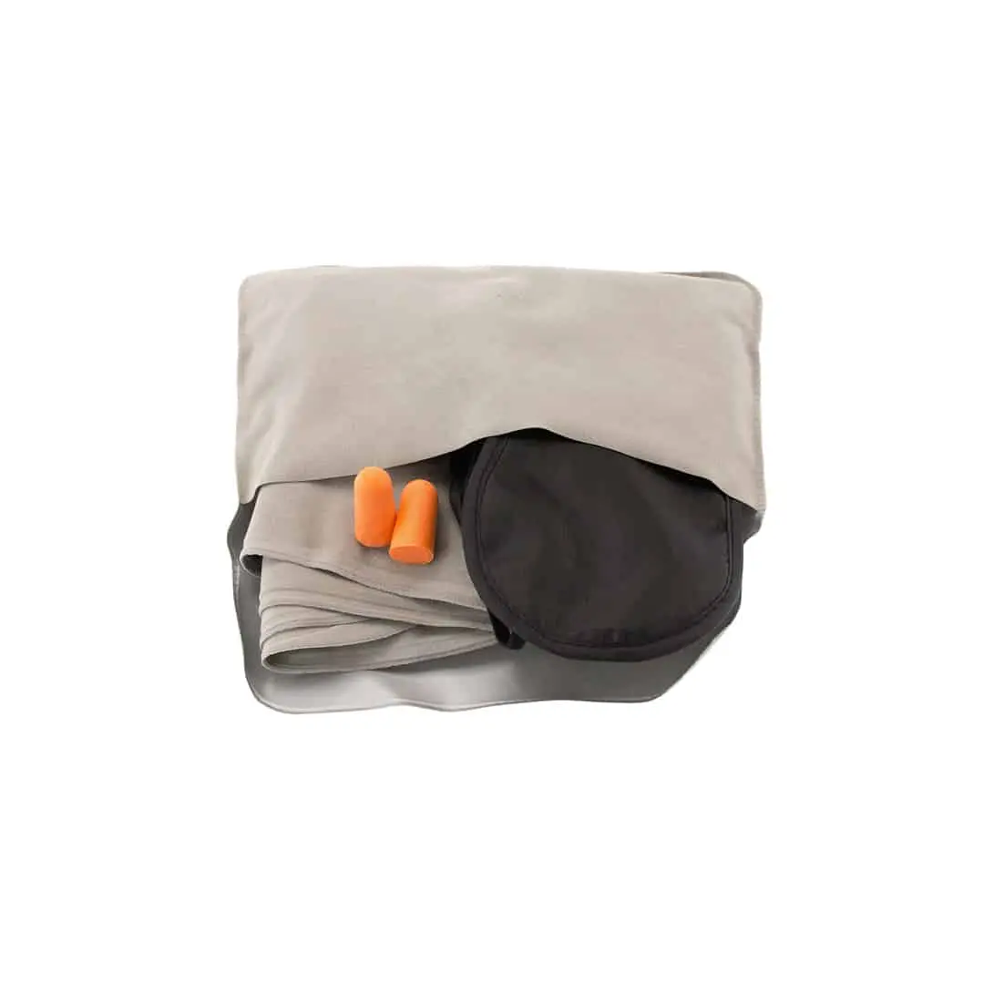 Voortaan kun je altijd lekker slapen in het vliegtuig, de trein of in de auto, dankzij deze praktische en compacte reisset! De set bestaat uit een slaapmasker, reiskussen en oordopjes, zodat je geen last hebt van het licht en het geluid om je heen en je lekker comfortabel kunt zitten. Het slaapmasker is gemaakt van lekker zacht microvezel materiaal met elastische bandjes en de oordopjes zijn gemaakt van comfortabel EVA, waardoor deze bij iedereen zullen passen. Door het opblaasbare reiskussen voor in je nek zit je altijd comfortabel. Dit reissetje kan niet ontbreken tijdens jouw vliegvakantie en is ook zeer geschikt als je niet kunt slapen op de festivalcamping!