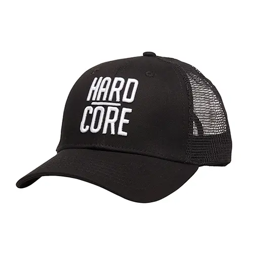 Festival cap met geborduude opdruk: Hard core – Strak afgewerkt in het zwart – Curved trucker model – Mesh achterkant – Verstelbare sluiting