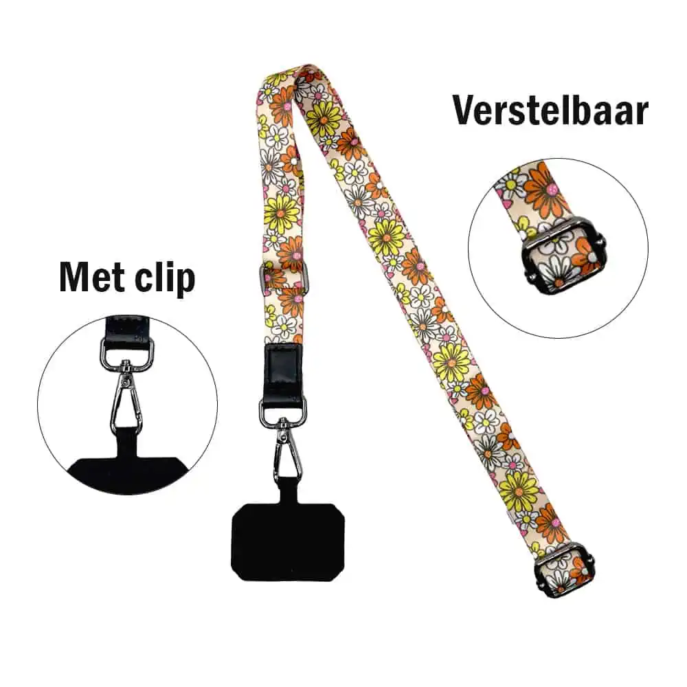 Dit universele telefoonkoord met bloemetjes print past op iedere telefoon in combinatie met een hoesje.