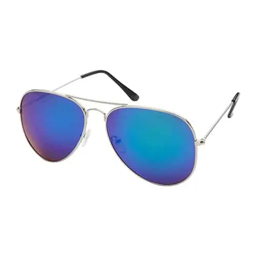 Zilveren piloten zonnebril met blauw/groene spiegel lenzen.